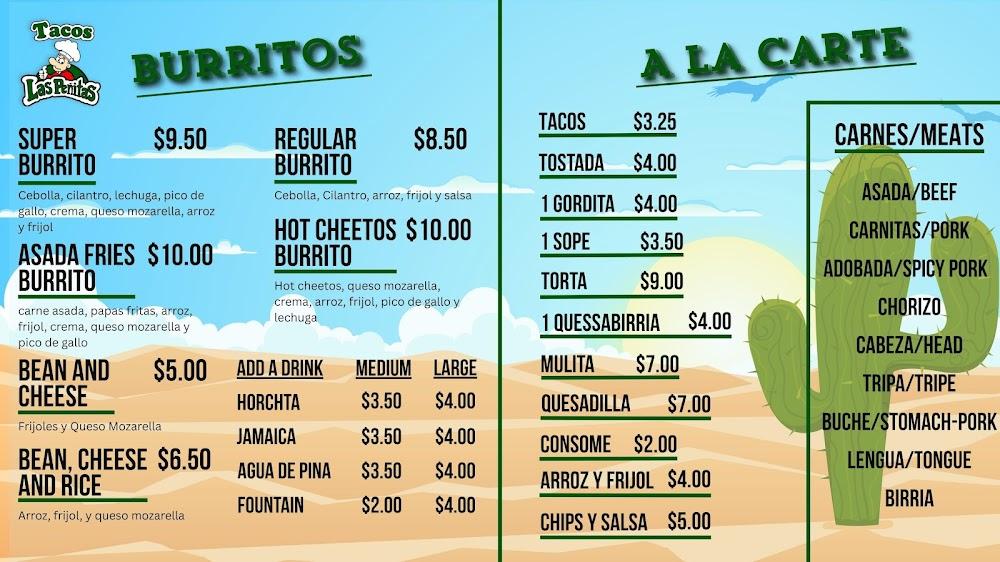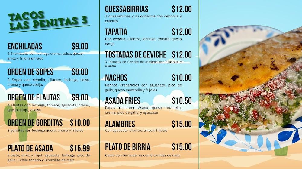 The menu at Tacos Las Penitas 3 Inc. is a true representation of Mexican cuisine. With around 48 different dishes, options abound for everyone. Popular items include tacos filled with tender meats, flavorful burritos, and classic enchiladas. Unique salsas such as habanero and avocado add zest to every bite. Small plates offer a chance to sample various tastes, perfect for sharing or snacking. The clear pricing makes it easy to indulge without worrying about costs. For drinks, refreshing aguas frescas and sodas are available. Each dish reflects traditional cooking methods, emphasizing fresh ingredients. The commitment to honor authentic recipes shines through in every plate served.